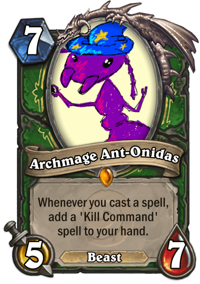 r/customhearthstone - 7 Archmage Ant-Onidas Whenever you cast a spell, add a 'Kill Command spell to your hand. 5 Beast 7 (Who knew the old guy had a pet ant? : r/customhearthstone) https://www.reddit.com/r/customhearthstone/comments/acgnfk/who_knew_the_old_guy_had_a_pet_ant/